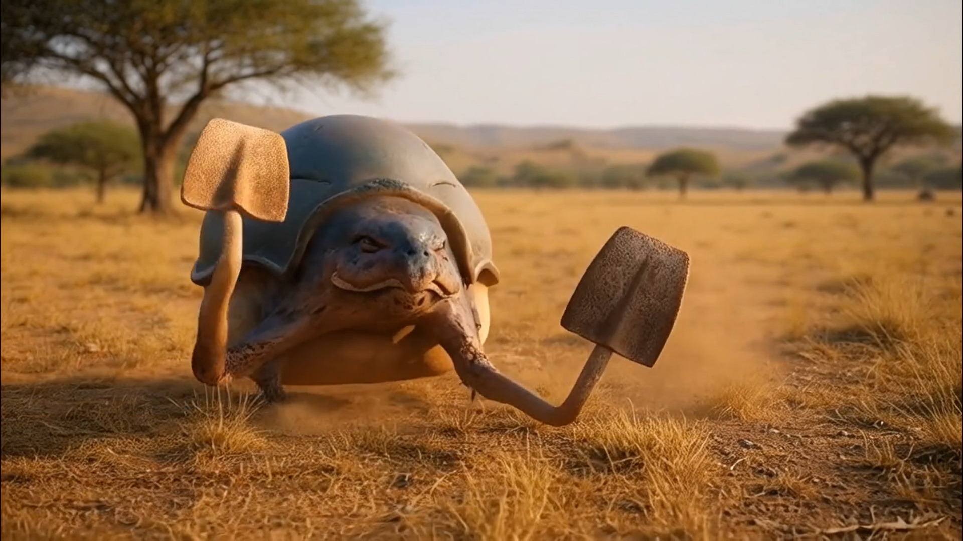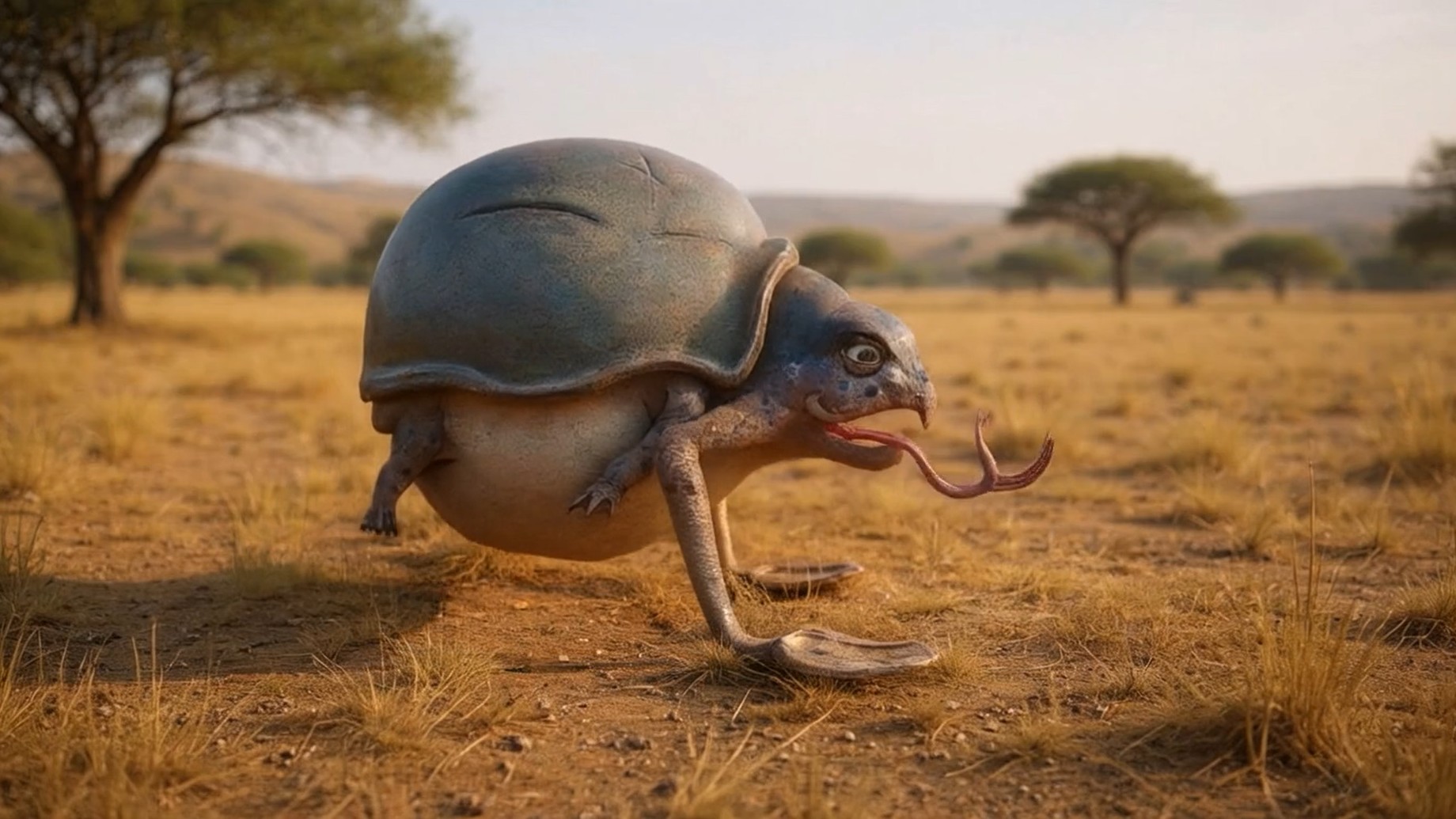 Charakteristika: Má kulovitý tvar. Železitá kůže na horním krunýři je až deset centimetrů hrubá, a proto jsou jen velmi málo pohybliví. Má však pohyblivé lopatovité kly, díky kterým se umí rozhoupat a odrazit od země, poté své lopaty sklopí za hlavu a kutálí se pláněmi, a to tak dlouho, než do něčeho narazí. Končetiny jsou krátké, zakrnělé a téměř zbytečné. Používá je jen výjimečně. Dokáže se nimi jen mírně odstrkovat od země, k chůzi jsou nepoužitelné. Používá je hlavně k hrabání v trávě, když si staví hnízdo k nočnímu odpočinku.
