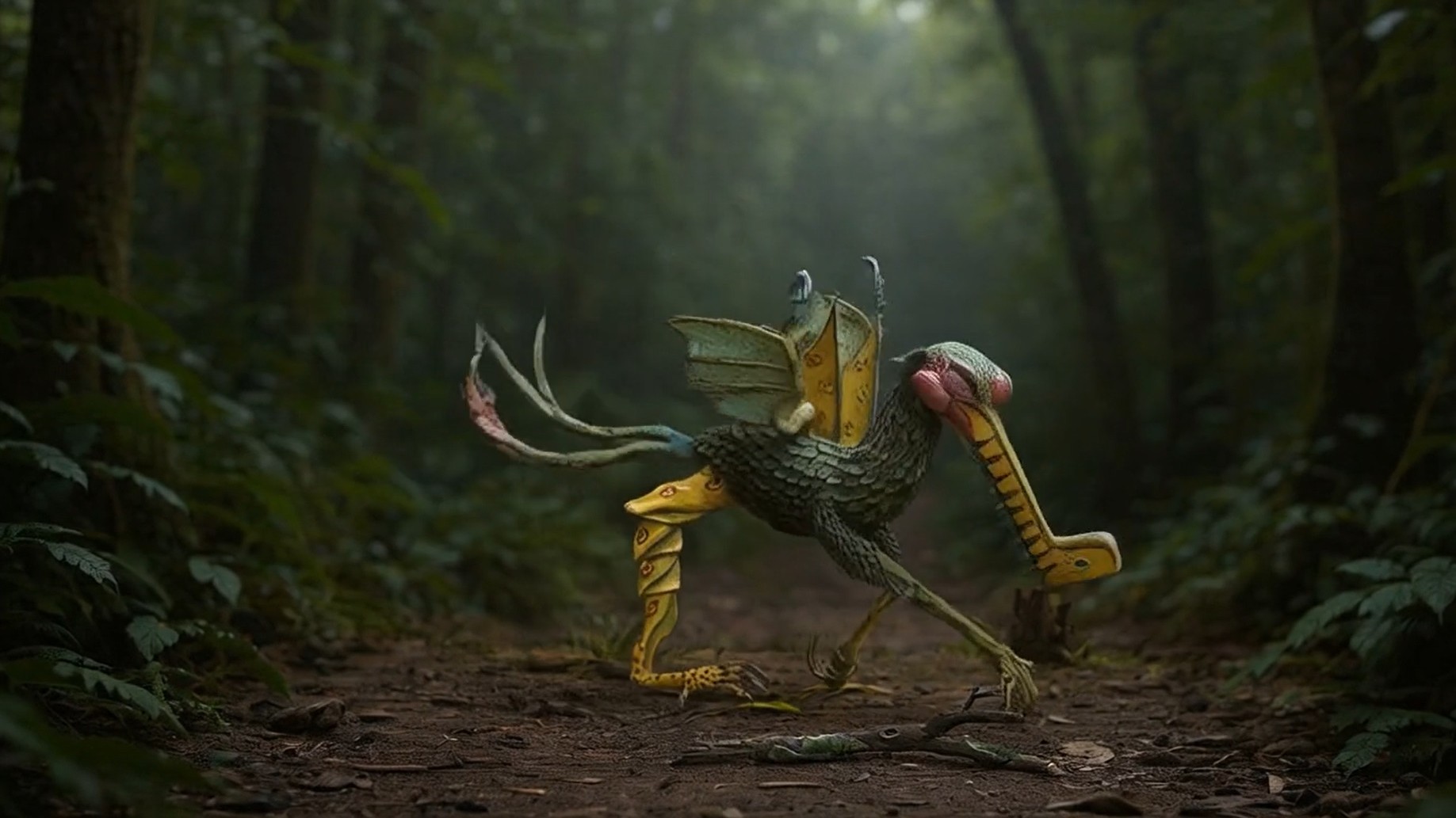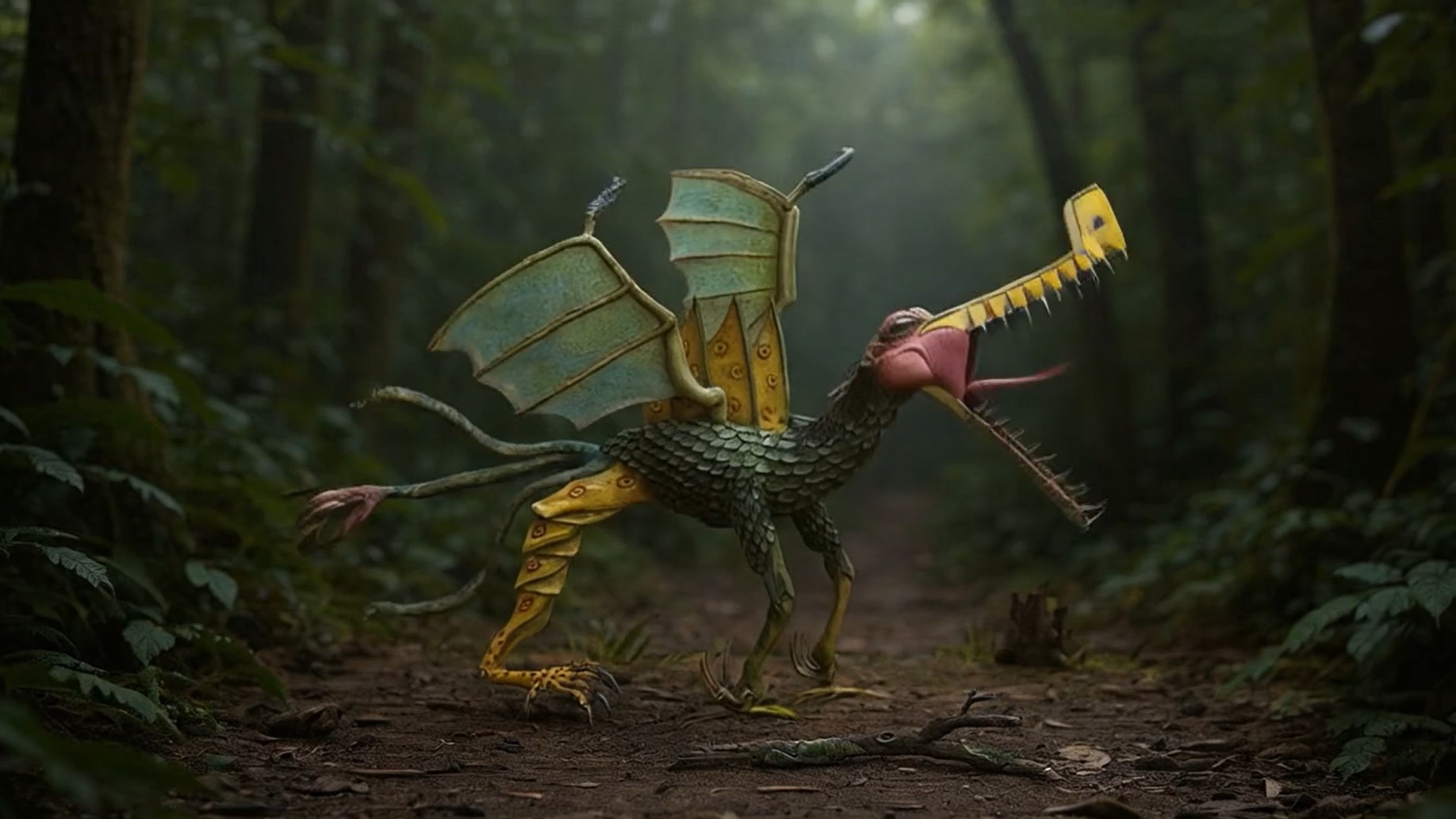 Charakteristika: Má dlouhou tlamu plnou ostrých zubů. Jako obranu před nepřáteli používá oblak hustého modrého dýmu, který vypouští z ocasů. To mu dává podstatně větší šanci k útěku. K upozornění ostatních členů hejna na blížící se nebezpečí používá kožní vak pod okem, který při vyfouknutí vydává daleko slyšitelný pisklavý zvuk.
