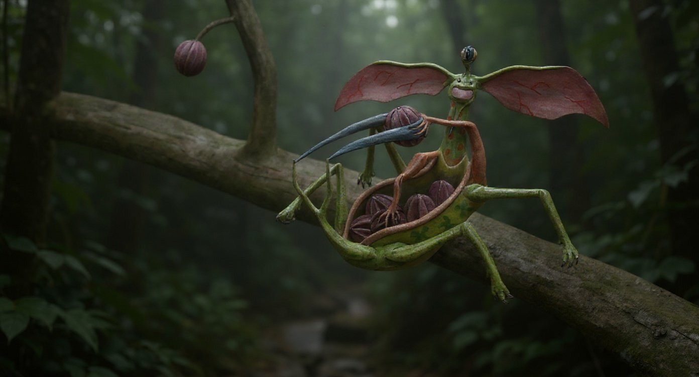 Charakteristika: Vyznačuje se velkýma blanitýma ušima, díky kterým plachtí ze stromů na zem. Ze svého prakovitého výrůstku vystřelují kokosové bobule na obranu před dravci.